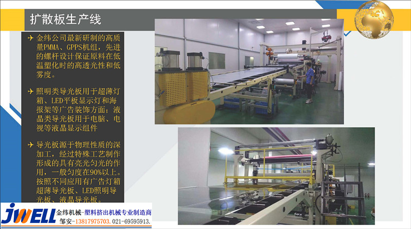 金緯公司先進的螺桿設計保證原料在低溫塑化時的高透光性和低霧度。可生產PC、PMMA、MS、PS材質的免絲印、雕刻、印刷、熱壓等工藝的高品質導光板。 導光板/擴散板主要用于超薄燈箱、LED照明、廣告裝...